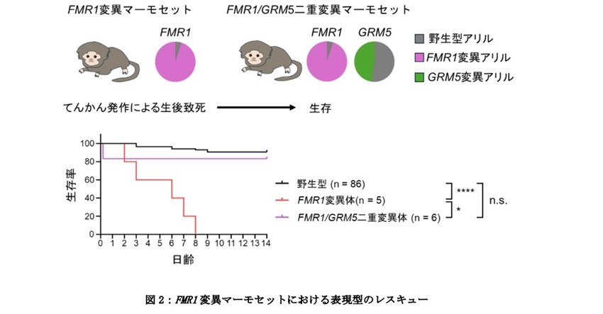 この研究で、FMR1遺伝子に変異が導入され、遺伝子産物がほとんど認められないファウンダー個体では、多動や自発性てんかん発作が確認されました。このてんかん発作は新生児期の致死を引き起こしましたが、代謝型グルタミン酸受容体5型をコードするGRM5遺伝子に変異を導入したFMR1/GRM5二重変異体では、この致死が救われることが明らかになりました。この結果は、mGluR5シグナルの過剰な活性化がFMR1変異ファウンダー個体の症状に寄与していることを示唆しています。