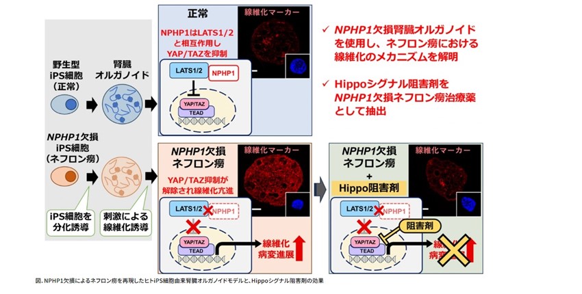以上の研究成果より、NPHP1欠損ネフロン癆においてHippoシグナルが線維化の進展に関与すること、そしてHippoシグナル阻害剤が治療薬候補となることを世界で初めて明らかになりました。同成果は、これまで有効な治療法が存在しなかったネフロン癆研究に大きな意義を持つ報告であり、研究グループは、既に臨床で利用されている薬剤の有効性が確認されれば、早期の社会実装につながる可能性があるとしています。