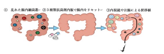 抗菌剤併用腸内細菌叢移植(A-FMT)療法とは、3種類の抗菌薬(アモキシシリン、ホスホマイシン、メトロニダゾール)を併用し、乱れた腸内細菌叢を極限まで減らしてクリアにした後、ドナー便から生成した腸内細菌溶液を内視鏡や注腸により注入し、バランスのとれた腸内細菌叢の構築を図る治療法です。