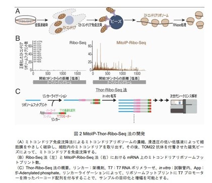 今回、共同研究グループが開発した「MitoIP-Thor-Ribo-Seq法」は、既存のRibo-Seq法を改良したもので、ミトコンドリア免疫沈降法(MitoIP)を用いてミトコンドリアリボソームを濃縮し、Thorと呼ばれるRNA増幅技術を組み合わせることで、ミトコンドリア翻訳の解析に特化しています。これにより、mRNA上のリボソームの翻訳動態を1コドン(塩基3個の配列)の分解能で解析することが可能になりました。