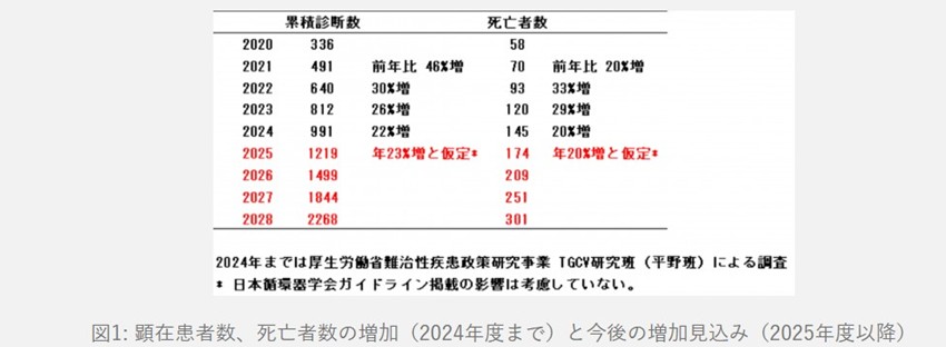中性脂肪蓄積心筋血管症(TGCV)は、2008年に同大学病院で心臓移植待機中の患者さんの調査から発見された疾患で、心臓や血管に中性脂肪が蓄積してしまう病気です。診断体制が確立されたことで、現在、確認される患者数が増加しています。