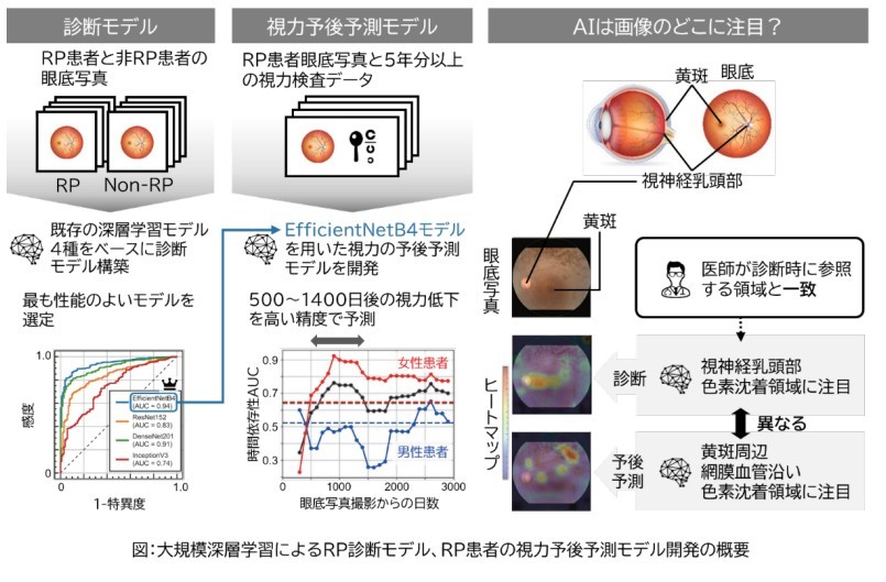 千葉大学は3月5日、進行すると失明に至る遺伝性の指定難病である網膜色素変性症(RP)について、眼底写真を用いた大規模深層学習モデルをベースに、診断および視力予後予測を行う方法を開発したと発表しました。