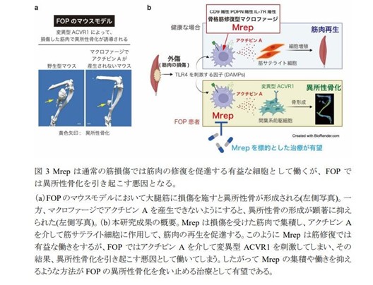 進行性骨化性線維異形成症(指定難病272、FOP)は日常の些細な外傷などが引き金となり全身の骨化を進行させる極めて重篤な疾患であり、現在根本的な治療法は確立されていません。進行性骨化性線維異形成症(FOP)のマウスモデルを用いた実験では、外傷をきっかけに集まったMrepが作り出すアクチビンAが、異常な骨を作る指令を出してしまうことが確認されました。通常は筋肉を治す味方である細胞が、病的な環境下では異所性骨化を誘導する悪玉細胞として働いてしまうことが突き止められました。