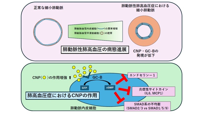 以上の研究成果により、肺動脈性肺高血圧症の発症・進展の新たなメカニズムを解明され、CNP-GC-B経路を標的とした新しい肺動脈性肺高血圧症治療薬の開発に期待が寄せられます。