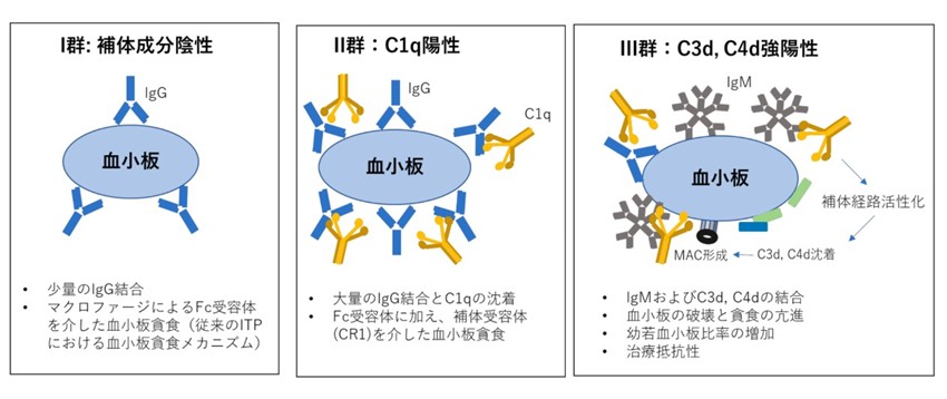 今回、研究グループは、免疫性血小板減少症(ITP)患者さん40名の血液を用いて、血小板の表面に結合した補体の成分などを分析。補体とは、病原体に対する生体防御機構のひとつです。分析の結果、血小板への補体成分の沈着パターンにより、患者さんを3つのグループに分類できることがわかりました。特に補体の活性化が進行しているグループでは、第一選択薬であるステロイドが無効となる例が多く認められました。さらに、このグループでは作られたばかりの未熟な血小板である幼若血小板の割合が増加していることが判明しました。幼若血小板の割合は自動血球分析装置で簡便かつ迅速に測定できるため、補体の活性化に伴う血小板破壊の進行が関与している患者さんを選別できる可能性が示されました。
